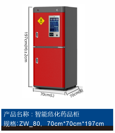 •该智能柜外机颜色按照存放药物类型分为红色、蓝色、黄色。 •该智能柜既可独立运行使用,也可以通过网络远程接入到危化品管理平台联网运行,在线管理。 •该智能柜可存放药瓶罐80瓶(每瓶≤2kg),对用户存取药品的名称、重量、柜存位置等信息,实时自动感知、自动采集、自动上报(精准定位到层和点;称量范围(0-2kg),称量精度0.1g,误差1g;存取称重药品的过程配有语音系统实时播报)。 •箱体上下共有2个单开门,每个柜门内部为一个独立的封闭式储物仓,每个储物仓内分为2个储物层。 •每个储物层托盘都具有抗酸碱腐蚀能力,托盘边沿具有≥1.5cm高的边沿,起到积液盘作用,防止液体遗漏或倾倒时流入下层;柜体底部安装有4个可移动滑轮和4个可手动调节柜体平衡的水平螺杆。 【产品特点】